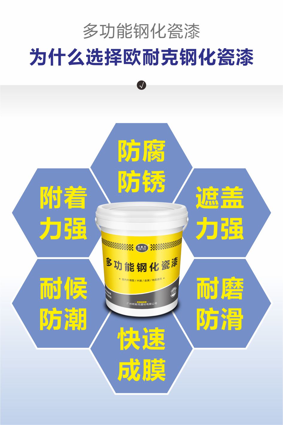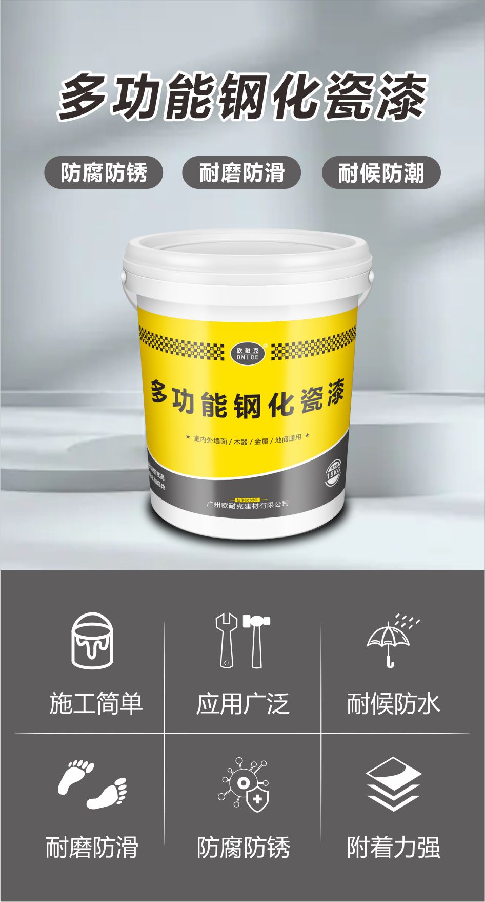 欧耐克多功能钢化瓷漆是以优质丙烯酸乳液为基料,精选超细度的无机、无毒颜料经科学配料,严格调制而成,达到防锈、防腐蚀的优异效果,以水为稀释剂,无毒无味,无污染,不燃不爆,确保环境保护和人体健康。