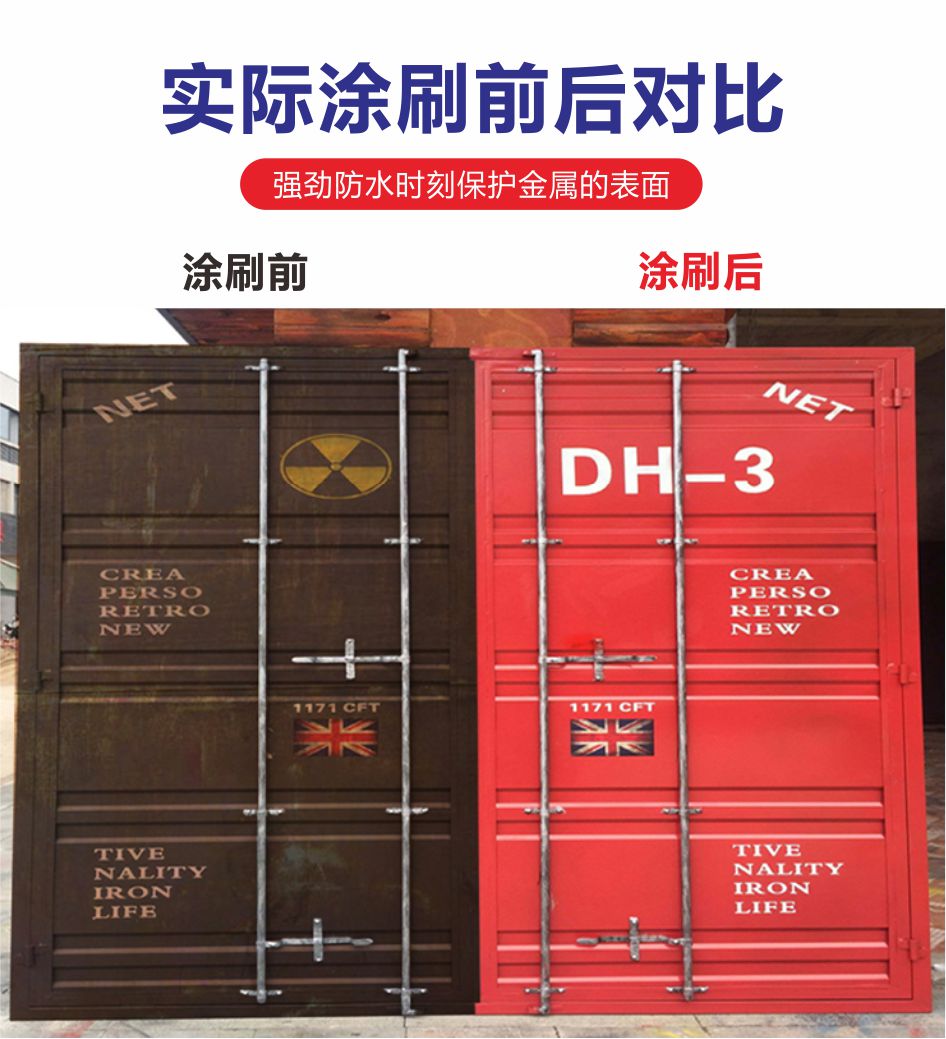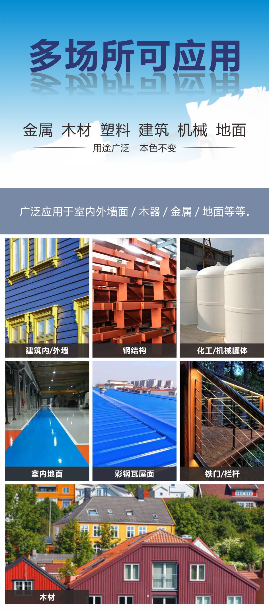 适用于金属屋面及钢结构、桥梁、木材、建筑表面、船舶、护栏、铁门、铁板等表面的防锈罩面保护和翻新。